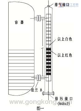 液位計采用連通器的原理。使容器內液體等高引入到液位計主體管內。在主體管內的漂浮浮球組件,根據浮力原理和磁性藕合原理。在主體管外附靠著能反映磁現象的翻柱作為液面位置的顯示。隨文體管內液位的變化,浮球組件的高低也相應變化。從而使主體管外的翻柱作180度的翻轉,當液位上升時,翻柱由白色轉為紅色,當液面下降時,翻柱由紅色轉為白色。顯示器的紅,白界位處為容器內介質液位的實際高度。從而實現液面的檢測目的如圖一所示。